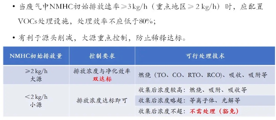 VOCs去除處理:收集的廢氣中NMHC初始排放速率<2 kg/h時,收集后濃度不超、可豁免VOCs處理,濃度達標即可。
