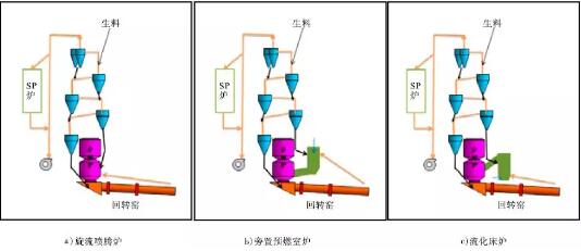 分解爐的型式有多種,以旋流噴騰爐、旁置預燃室爐和流化床爐三種爐型為研究對象,A和D生產線分別為典型的旁置預燃室爐和流化床爐型,重點對預燃室出口和流化床爐出口的煙氣成分進行了測試,結果見表4。三種不同型式分解爐如圖2所示。