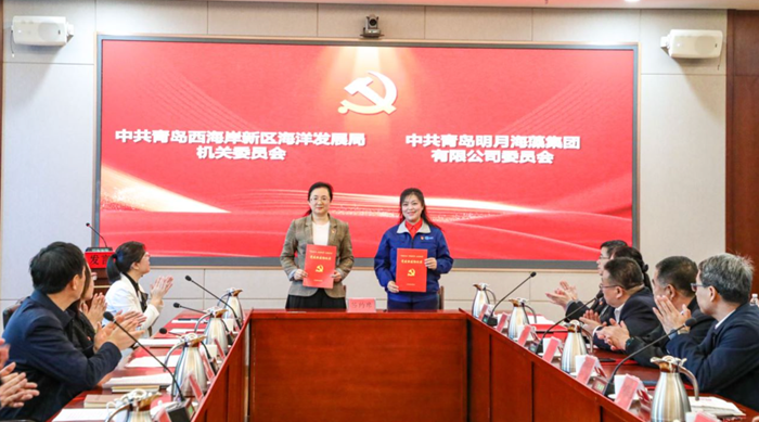 區(qū)海洋發(fā)展局機關黨委副書記王淑芳,青島明月海藻集團工會副主席、黨政辦公室總監(jiān)楊曉菁,分別代表雙方黨委簽約。