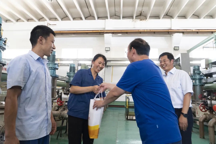 在慰問過程中,朱長濤首先了解了集團在高溫作業(yè)和高溫天氣作業(yè)勞動保護工作的開展情況,并深入生產一線將“清涼”送到職工手中。