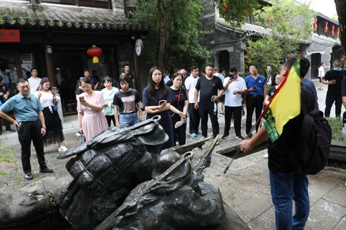 走進臺兒莊古城,處處都是古河道、古碼頭,舟楫搖曳,水巷縱橫,當?shù)氐拇迕裰_而居,大家立刻被濃厚的運河文化深深吸引,先后參觀了運河奏疏館、運河酒文化展館、運河漕幫鏢局博物館、藥典博物館、藻食記輕食文化館,形象直觀地了解了古運文化的源遠流長和老臺兒莊的風土人情。