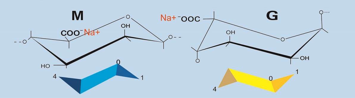 海藻酸鹽遇到鈣離子可迅速發(fā)生離子交換,生成凝膠,其凝膠具有熱不可逆性。高G型海藻酸鹽生成的凝膠硬度大但易碎;高M(jìn)型海藻酸鹽生成的凝膠則相反,柔韌性好但硬度小。調(diào)整兩種比例可生產(chǎn)不同強(qiáng)度的凝膠。利用凝膠特性,可用于制作各種仿生食品、用材料、面膜、廢水處理劑、保鮮膜等。