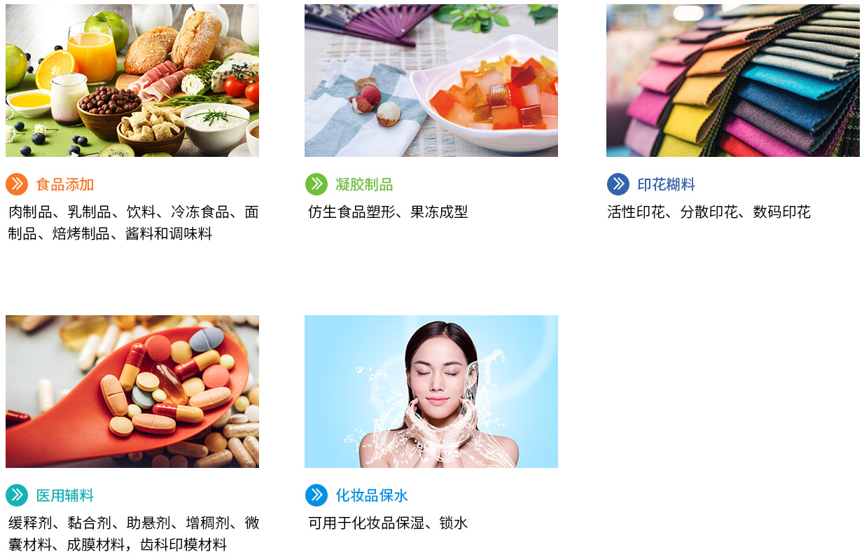 食品、化妝品增稠劑、粘合劑、穩(wěn)定劑、成型劑。食品中主要用于仿型食品、面食、飲料、肉制品、餡料、果醬、寵物食品等 |